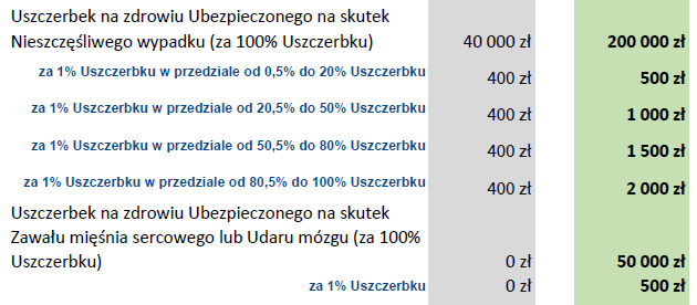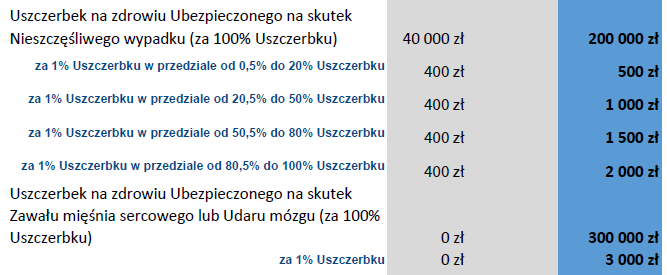 W nowej polisie całkowita suma za uszczerbek wzrosła aż o 400% (z 40 na 200 tysięcy) oraz wraz ze wzrostem uszczerbku rośnie ochrona