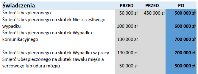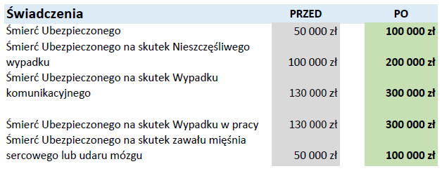 Świadczenia dotyczące śmierci ubezpieczonego zostały zwiększone od 100% do 130%