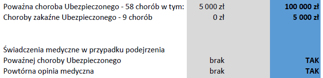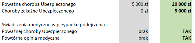 W nowej polisie wzrost z 5 do 20 tysięcy złotych oraz pakiet świadczeń medycznych (już przy samym podejrzeniu poważnej choroby) oraz powtórna opinia medyczna potwierdzająca lub wykluczająca poważną chorobę