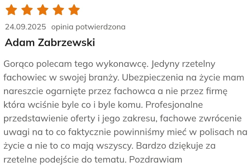 za tańszą miesięczną składkę otrzymał zarówno świadczenie 500.000zł na śmierć, którego potrzebował, ale także dużo wyższe sumy ubezpieczenia w przypadku śmierci w wyniku wypadku, czy w pracy